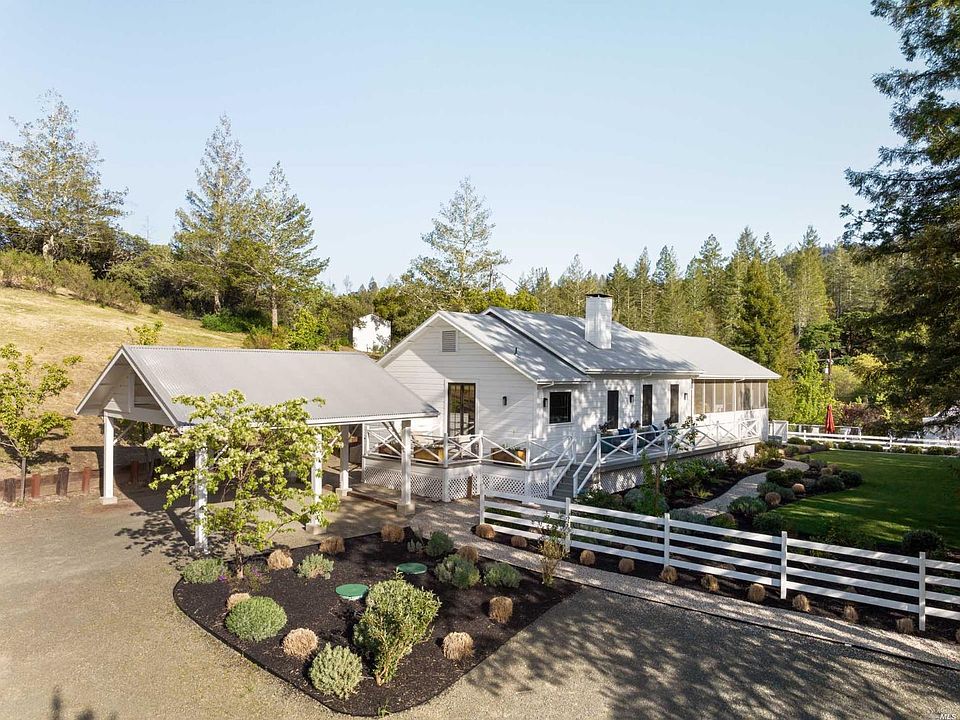 Chic modern farmhouse blends classic charm with contemporary luxury. Mature trees and lush greenery introduce the Taylor Lombardo Architects remodeled property offering privacy and tranquility. Minutes to Calistoga, Napa Valley's resort destination. Large decks wrap three sides. Screened dining veranda overlooks manageable lawn, gardens, and pool beyond. Natural light fills the intimate open-concept property. Living area and eat-in gourmet kitchen with high-end appliances and custom cabinetry flow seamlessly to dining veranda, providing nearly 2,000 sf of enclosed space. Primary suite has sizable office nook, a spa inspired bath, custom closets, and private lounging deck. Two additional bedrooms are generously sized and share a beautifully appointed bathroom. Sparkling round pool with ample outdoor entertaining space. Fenced yard provides room for gardening, playtime, and outdoor recreation. Additional features include two-car carport, laundry room, and ample storage. Easy drive to SF.