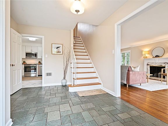 Stepping inside, the freshly painted walls, intricate wainscoting, and built-in details provide a polished yet homey ambiance. The revamped kitchen features stainless steel appliances, granite countertops, and contemporary cabinets.