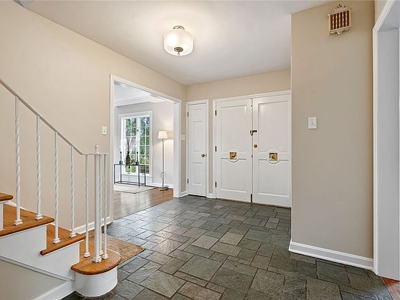 Set in the desirable Deerfield Manor and Williamsburg Woods neighborhood of Upper Saint Clair, this updated French Provincial home boasts four bedrooms and offers the ideal mix of classic allure and modern amenities. Positioned on a generous corner lot, the exterior showcases a distinct mansard roof, complemented by freshly painted brick and a welcoming new walkway.