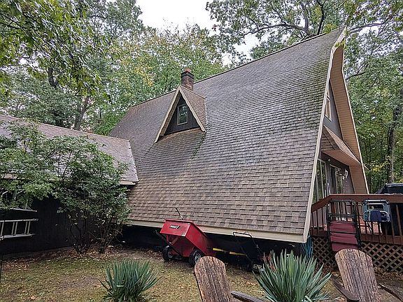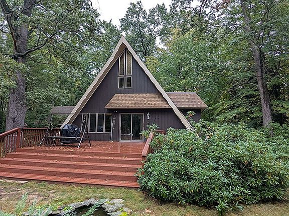 Unique 2-bedroom, 1.5 bath A-frame home with attached 2 car garage and “jut-out” for large kitchen, dining area and full bathroom. Open concept first floor living area perfect for entertaining with large windows for views of a variety of birds, wildlife and 2 small fish ponds. Remodeled in 2022 to enlarge the main floor bedroom and update large main floor bathroom with new cabinets, tiled floor, bathtub and tub to ceiling tiled shower walls. Laundry room with cabinets on first floor also. A spiral staircase in the open living room takes you up to a balcony above the living area and a walled off large bedroom with half bath, closet and built in bookshelf. Large windows and nearby trees give the feeling of sleeping in a treehouse.