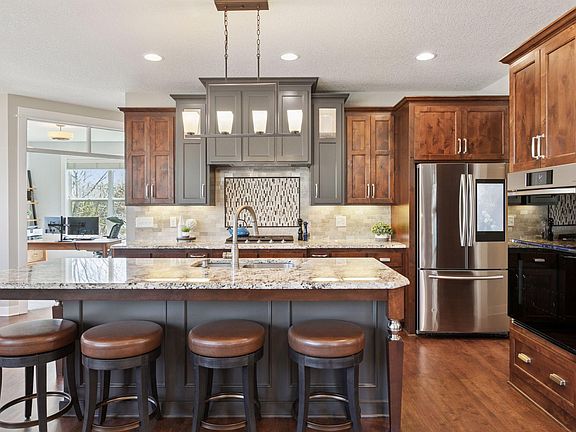 Welcome to this incredible 2-story home located on a quiet cul-de-sac with panoramic views overlooking serene wetlands ~ frequent sightings of wildlife ~ easy access to miles of scenic trails to enjoy ~ nature enthusiast dream. Inside, a gracious open floorplan awaits. The living room boasts dramatic coffered ceilings, a gas fireplace flanked by built-ins, and a wall- of-windows bringing the outdoors in. The kitchen features a stunning furniture-style breakfast bar with granite countertops, a timeless tile backsplash, stainless steel appliances, and a mix of natural wood and enameled gray cabinetry, including glass display fronts. Adjacent, find a formal dining room, a coffee/butler's pantry, and the dinette overlooking the wetlands for tranquil meals plus easy access to the large 12x26 deck—perfect for outdoor cooking, entertaining, and relaxation. The office features stunning glass French doors with transom windows, while the mudroom with cubbies keeps you organized. 4 bedrooms on one level with primary suite offering a double-door entry, a luxurious master bathroom with a double sink vanity and a step-in shower. Additionally, there's a full Jack and Jill bathroom and a private secondary ensuite. A convenient bedroom-level laundry room completes this level. The finished lower level walkout boasts a full wet bar, 5th bedroom, family room with perfectly appointed windows for peaceful backyard views. Large storage room for all your extras!