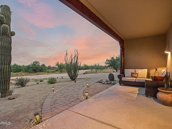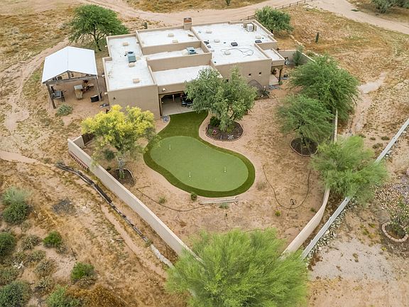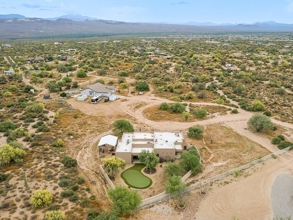 The best of desert living on this private serene 1+ acre setting with unobstructed amazing mountain views. Enjoy coffee and the sunrise from your front porch and wine and sunsets and star gazing from your large fenced backyard complete with putting green. Productive private shared well with one neighbor. Custom split open floor plan with fireplace, custom cabinets, granite slab, Jenn-Aire appliances-gas stove , built in refrigerator, and walk-in pantry. High end fixtures, with recessed lighting throughout. Large master suite with separate shower and jetted tub and oversized walk-in closet opens to outdoor patio with built in BBQ. Oversized laundry. Cooled 3 car garage complete with workshop and cabinets. No HOA.