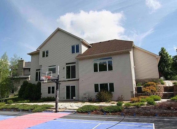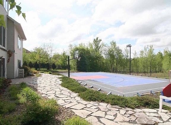 Dynamite walkout w/HW floors, Marvin windows. 2-story family rm W/FP, kitchen w/island. Large bedrooms & baths. Master suite and bath. Hardwood through majority of main floor. Main floor office could be BR. Finished walkout basement with media room, wet bar, bedroom and fitness room. Fabulous sport court for basketball to hockey. Deck overlooking sport court and large backyard. Insulated attached garage with concrete driveway.