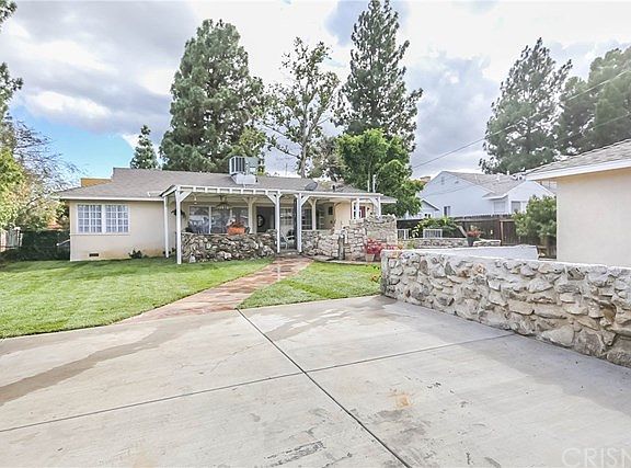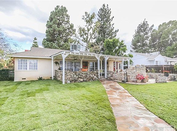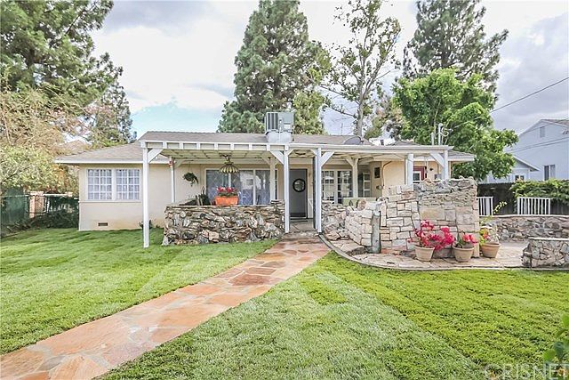 Granada Hills adorable charmer! Cute as a button! This Granada Hills cutie has rich warm hardwood floors, updated kitchen which is open to the living room, dual paned windows, smooth ceilings and open airy feel. Living Room and Dining Room combo with a wall of windows overlooking this lush, romantic rear yard. Ensuite Master bedroom with ample closet, remodeled bathroom with open concept shower. 2 bedrooms on the other side of the home, also with an updated bathroom with bathtub. Indoor laundry room too. A really special outdoor living area, truly extends the living space. Bubbling rock waterfall, large covered patio, stone walls and lush, lush landscaping. Feels like an oasis, perfect garden area, lots of grass to play on, parking for 3 cars/RV Access, electric gate, stone walk ways, fruit trees. Central Air, copper pipes, and closets galore, this is a must see home!