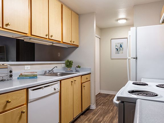 Each of our units comes with the perfect Galley style kitchen for entertaining, great spaced living room, your own patio, full size washer and dryer, a parking space that's all yours, a wonderful dog park, playground and lots more!