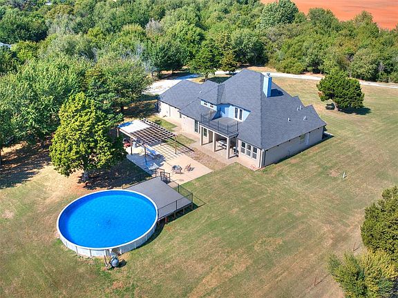 This Luxury Home sits on 9.67 acres. It’s the perfect combination of high end amenities and serene country style living. There’s plenty of room for all your toys. Inside you will be greeted with soaring ceilings & large tile floors that measure 22.5” x 22.5” on the first floor. Wood like vinyl flooring upstairs. Granite countertops throughout home. The warm and inviting living room is filled with natural light and offers a cozy fireplace with a mantle. A half bath is conveniently located near the downstairs living room for guests. The stunning kitchen boasts tiled backsplach, buit-in stainless steal microwave-oven-dishwasher, electric cooktop, pot filler faucet above cooktop, ducted vent hood, and plenty of cabinets for storage. All bedrooms are large and spacious. The primary suite is fit for a king and is connected to the primary bath and closet. The primary bath offers dual vanity sinks, and large whirlpool tub, tile steam shower with glass doors, and built-in’s. His and her’s closests provide plenty of space for a well organized wardrobe. Across the home are two bedrooms with a Jack and Jill bathroom. Upstairs you will find the fourth bedroom and another full bath, secondary living room with balcony access, and a bonus room that could be utilized as a theater room, study, game room etc.. Outside you can relax under the covered back porch or while sitting under the pergola enjoying the sun. The oversized above ground pool is complete with a deck. A half bath is located to the left of the back porch, making cleaning up and drying off a breeze after a swim. There are two Hvac units that are divided into 4 zones, providing energy efficiency. The two tankless hot water tanks are powered by propane. One hot water tank services the primary bathroom and the other services the rest of the home. The entire home is insulated with spray foam. There is also a water softening system. Right off of Hwy 33 & minutes from Hwy 81. The Kingfisher Golf Club is right down the street.