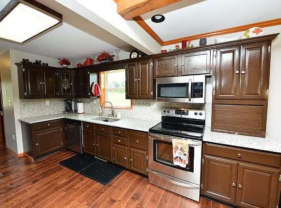 Sitting on 6.8 acres is this Rustic Charmer offering 2347 sq.ft & 3 BR's & 3.5 Baths.Lovely finishes & updates incl. Many New Windows,New Front,Back & Bsmt Ext Doors,New Flooring throughout entire home, all updated bathrooms,New Roof,New A/C & Furnace,New Pressure Tank for Well,New Sump Pump & Updated Kitchen.The four car garage and 55 x 31 (approx) Pole Barn is ideal for all your storage/hobby needs.Finished Rec Rm in Bsmt expands the living space.Soaring ceiling in great room with fireplace is gorgeous.