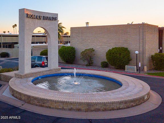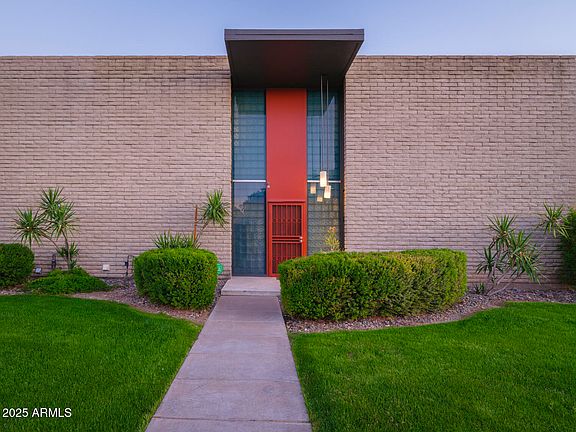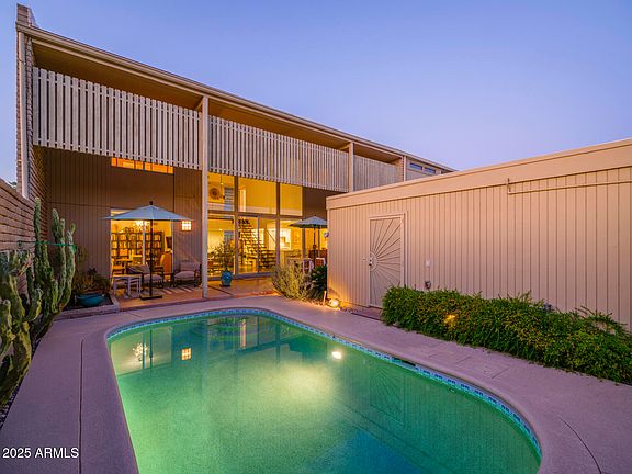 Experience mid-century modern perfection in this rare Alfred Newman Beadle-designed Roman Roads townhouse. This architectural gem features soaring 18-ft stacked windows, integrated frosted glass bookshelves, a floating staircase, and exposed block walls. The spacious two-bedroom layout offers an open-concept design with a seamless indoor-outdoor flow, leading to a private courtyard and cocktail pool. Thoughtfully updated, it boasts a sleek modern kitchen, renovated baths, and a catwalk connecting two master suites. Nestled in a lush, walkable community near Restaurant Row, scenic canal paths, and Phoenix Mountain Preserve, this home offers timeless design and supreme livability. Own a piece of history today! Alfred Newman Beadle Masterpiece