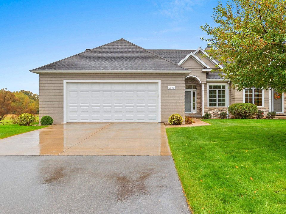 Sought-after De Pere Condo! This one-owner corner unit offers privacy, beautiful views, and generous living space with 2,386 sq ft. Overlooking a picturesque ravine and surrounded by green space, this home features 3 bedrooms and 2.5 baths. The kitchen includes raised panel cabinets, a center island snack bar, and an open layout perfect for entertaining. The primary suite offers a tray ceiling, walk-in closet, and private bath. Enjoy relaxing in the great room with a cozy fireplace or in the walk-out lower level featuring a spacious rec room and egress windows. A 9-ft patio door opens to a peaceful outdoor setting. Additional highlights include a heated garage with water and quality craftsmanship throughout.