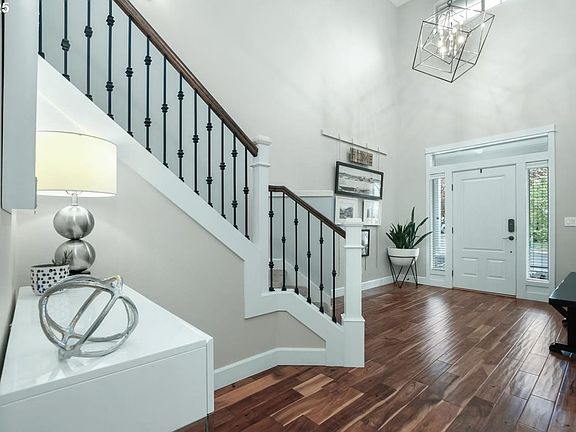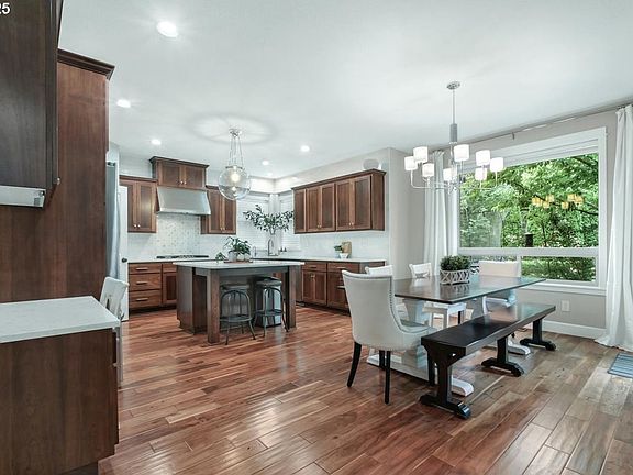 This stunning 6-bedroom, 3-bathroom home blends elegance and functionality with designer updates and a beautifully landscaped backyard. A grand entry with soaring ceilings and contemporary lighting leads to a bright, open layout. The custom kitchen boasts Rejuvenation hardware, statement chandelier, Thassos marble tile, quartz countertops, GE Profile appliances, and hand-scraped acacia floors. Thoughtfully updated bathrooms feature custom cabinetry, quartz, and premium finishes. A main-level bedroom and bath offer flexibility, while an oversized upstairs bedroom can serve as a media room or gym space. Ample storage includes walk-in closets, a 3-car garage with Gladiator racks, and a backyard shed. The private backyard oasis features lush landscaping, large paver patio, tranquil water fountain, and a covered patio. Smart upgrades include irrigation, Nest Thermostat, Schlage Smart Lock, and whole-home water filtration. Ideally located near top Beaverton schools, Murray Hill, and Progress Ridge. Over $182k of improvements to the interior and exterior. Possibility of assumable loan at 2.5%.