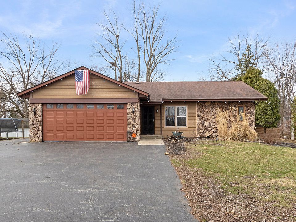 BACK ON THE MARKET! This awesome 3 bedroom, 2.5 bathroom home, sits on just under an acre of land. Custom stone built exterior offers an attached 2 car heated garage plus a 2 car detached garage with loft. 3 storage sheds located on the private wooded lot. Paver brick patio leads to built in gas bonfire pit. Roof only 10 years old(tear off 2015). Inside brings a unique floor plan offering a related living option. All the majors have been taken care of including, brand new appliances, cabinets and counters in main kitchen area. New carpet in bedrooms. Fresh paint and updated flooring through out, plus new washer and dryer in laundry area. Enjoy a 1 year home warranty for added peace of mind. Located near express way for convenience. Move right in and enjoy on this one, schedule today!