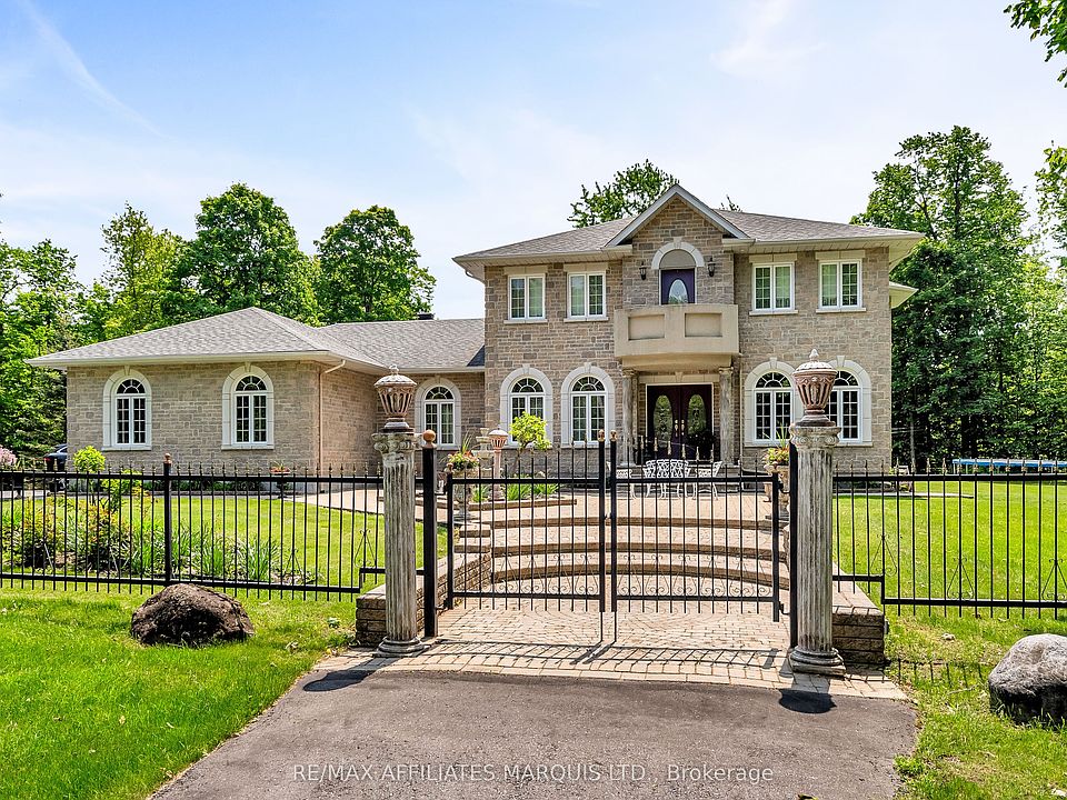 The moment you walk through the front door of 16935 Beaver Dam Drive, you can't help but pause. Gleaming granite floors capture the light and draw your eyes toward the breathtaking curved staircase that sets the tone for the entire home. From the first step, it's clear - this is more than a house. It's a statement of timeless elegance and craftsmanship, where luxury and comfort intertwine effortlessly. Built in 2003 with no expense spared, this Greece-inspired masterpiece was designed for those who appreciate quality in every detail. The formal dining room, framed by stately columns, flows into a refined living room anchored by a gas fireplace. Just beyond, the granite-clad kitchen overlooks the family room, where a wood-burning fireplace and custom mantle create a cozy retreat. An adjoining games room adds a touch of fun - a welcoming space for entertaining, complete with room for a pool table. Upstairs, the primary suite serves as a private escape behind double doors, featuring a six-piece ensuite, walk-in closet, and access to a spacious balcony where mornings begin with fresh air and peaceful views. Three additional bedrooms and a well-appointed four-piece bath complete the second level, offering flexibility for family or guests. Additional touches like the whole-home intercom system reflect the thoughtful design that carries throughout. Nestled in the prestigious Beaver Dam subdivision, this 1.7 acre property represents luxury living at its finest - where craftsmanship meets the serenity of country surroundings. Every detail has been carefully curated, creating a residence that is as impressive as it is inviting.