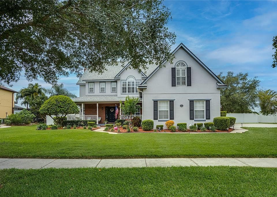 Welcome to this stunning 5-bedroom, 3-and-a-half bath, 2-story home. The home is in the highly desirable community of Taylor Ridge, in beautiful Kissimmee. This home offers class and luxury with its spacious layout and stunning design. As you approach the property, you will be greeted by a beautiful exterior with mature landscaping that sets the tone for the rest of the home. You will immediately notice the large front porch just waiting for some rocking chairs for relaxation. Walking into the house, you encounter high ceilings, wood floors, and spacious living areas. Entering the home, you will see the formal dining to the right, which leads into the kitchen. The kitchen and dinette offer ample space for hosting guests and family gatherings. The kitchen features stainless steel appliances, solid countertops, wood cabinets, an island, and a pot rack in the center of the ceilings. The island includes dual sinks, a breakfast bar, and a dishwasher. One of the most remarkable features of the kitchen is the large dining room windows overlooking the pool and porch area. Just picture enjoying meals while also taking in the stunning views from your kitchen. The great room is perfect for cozy movie nights with your loved ones while you sit in front of the electric fireplace. This home also features two primary bedrooms. One of the primary suites is on the first floor; you can use this as a guest suite or for yourself. The first-floor primary suite includes a large walk-in closet and an en suite bathroom. The primary bath in this room contains a stand-up shower beautifully lined with ceramic tile and a garden bath ready for you to relax after a long day. This bathroom has split his and hers sinks and a linen closet. Heading upstairs using the stunning wood floor stairs with beautiful railing, you will find the bedrooms equipped with ceiling fans to ensure maximum comfort during hot summer days. The second floor also includes a playroom or office and a large loft. The spaces on the second floor will create a place to get creative with your design choices. You will also find the second primary suite on this floor. It also includes an en suite bathroom with a tub and a single sink vanity. This home also has a laundry room for your convenience. Throughout the house, you will find stunning plantation shutters, which allow the rooms to stay cool on hot summer days. This home boasts relaxation with the Florida room overlooking the gorgeous backyard and fenced-in pool. Just picture yourself sipping your favorite beverage as you view the birds in the clear blue skies outside. Outside, the backyard features a large porch, providing a comfortable place to relax in the afternoons while enjoying the outdoors. You will also find a small brick patio encompassing a koi pond where you can let your mind take you away. The backyard also includes a sparkling pool, the perfect place to cool off during the hot Florida summers. The home is conveniently located near hospitals, shopping, restaurants, and more. Just minutes away from major highways, including 192 and Florida's Turnpike. Take your chance to call this beautiful home your own! Room Feature: Linen Closet In Bath (Primary Bathroom).