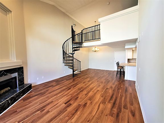 Spacious top floor condo with high ceilings and tons of natural light. The living room with 17' ceilings has a spiral staircase that leads to upstairs loft that can be used for whatever you desire and also leads to a balcony with a view! Large master bedroom comes with huge walk-in closet and master bath. This great condo also comes with a gas fire place, in unit washer & dryer, 2nd bedroom and bath, and new wood flooring. This condo is located near freeways, shopping and restaurant and comes with a roof top pool with view and 2 subterranean parking spaces. Don't miss out!