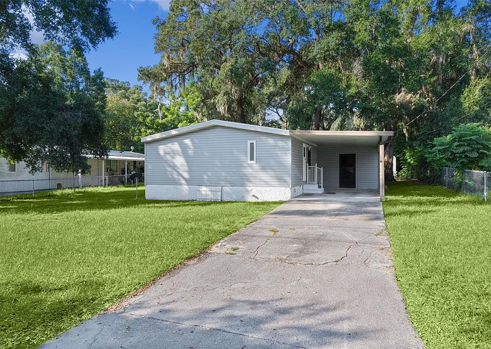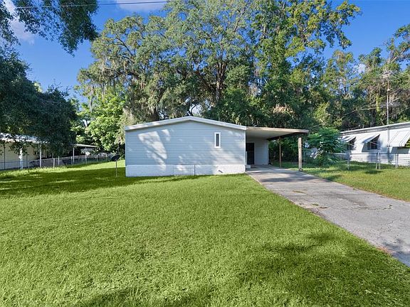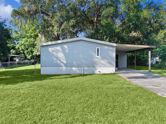 Conveniently located just off US 441/27 near The Villages, this well-kept double-wide manufactured home partially furnished offers the perfect blend of accessibility and tranquility. You're minutes from shopping, dining, and medical facilities, yet far enough to enjoy peace and quiet away from the crowds. Best of all, you own the land—no lot rent and no HOA restrictions. Inside, the home features three bedrooms and two bathrooms with a spacious open floor plan, an eat-in kitchen, and a cozy fireplace in the living room. A brand-new HVAC unit has just been installed, along with new carpet and a newer roof, making this home move-in ready. The utility room off the carport includes laundry hookups and generous storage space. Outside, the large yard offers plenty of room to enjoy, plus an extra storage building at the back of the property. The home is on well and septic, with plumbing recently reworked to the septic tank. Currently vacant and easy to show—please use Showing Time to schedule your visit. As requested by the owner, kindly remove shoes or wear the provided footies during your tour, and don’t forget to leave your card and feedback.