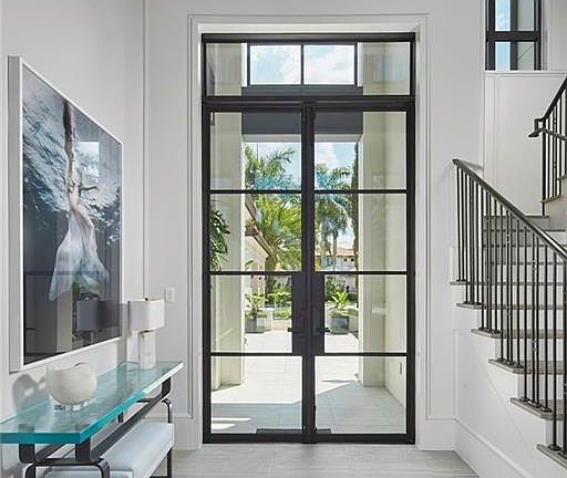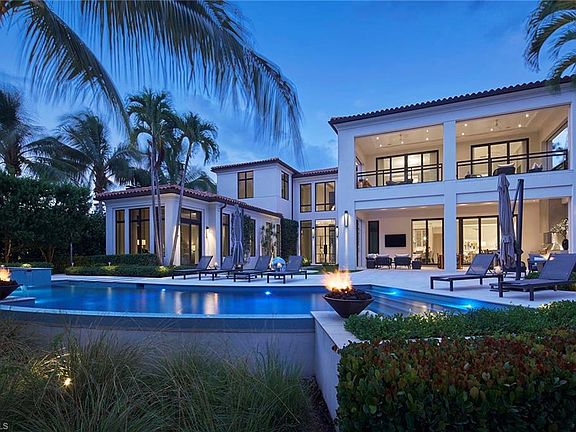 IMMEDIATE GOLF MEMBERSHIP AVAILABLE! This custom designed estate is situated on a private panoramic homesite within the prestigious Cortile neighborhood in Mediterra Golf and Country Club. The home features nearly 7,000-square-foot of luxurious living with five-bedrooms plus study and is ideally located on a lush private homesite offering panoramic preserve, lake and golf course views of both the North and South finishing holes. A soaring, bright and airy two-story foyer adorned with custom beams welcomes you through modern double glass doors. Constructed in 2019 and designed by acclaimed interior designer Brian Gluckstein, the residence is a study in architectural refinement. The interior is highlighted by extensive use of natural light, wide-plank white oak flooring, meticulously crafted ceiling details and refined cabinetry by SOHO. Detailed millwork, integrated lighting design, and designer hardware elevate the home’s overall aesthetic. The formal living room with a natural gas fireplace seamlessly transitions an open-concept more casual family room, and a gourmet kitchen featuring a white Caesar stone waterfall island, Wolf six-burner gas range with custom hood, built-in steam oven, warming drawer, Miele dishwasher, Sub-Zero refrigeration, and under-counter wine storage. Adjacent spaces are defined by symmetry and scale with artful transitions between rooms via inset door frames and coffered ceilings. Expansive pocketing sliders open to a covered lanai with a Lynx gas grill, Perlick beverage drawers and automated screens and shutters—perfect for year-round alfresco entertaining and storm protection. The resort-style gas heated pool and spa are flanked by dual fire bowls with water spillovers and a freestanding fire pit offering tranquil views and exceptional privacy. The primary suite features dual walk-in closets, dual water closets, glass-enclosed shower with dual heads and a freestanding modern soaking tub. One main-floor guest suite, three second-floor guest suites, a loft with wet bar & entertainment wall, expansive covered sunset overlook balcony with automated screens and shutters and secondary laundry provide ample space and convenience for visiting family and friends. Additional features of this magnificent property include a natural gas-powered Generac generator, Andersen 400 Series impact-rated windows and doors, elevator, four-car climate-controlled garage spaces and Control4 home automation. A world of luxury awaits you in Mediterra featuring two Tom Fazio-designed championship golf courses, a Gulf-front beach club and restaurant, tennis and pickleball courts, an updated clubhouse, and a soon-to-be-expanded new sports and lifestyle center.