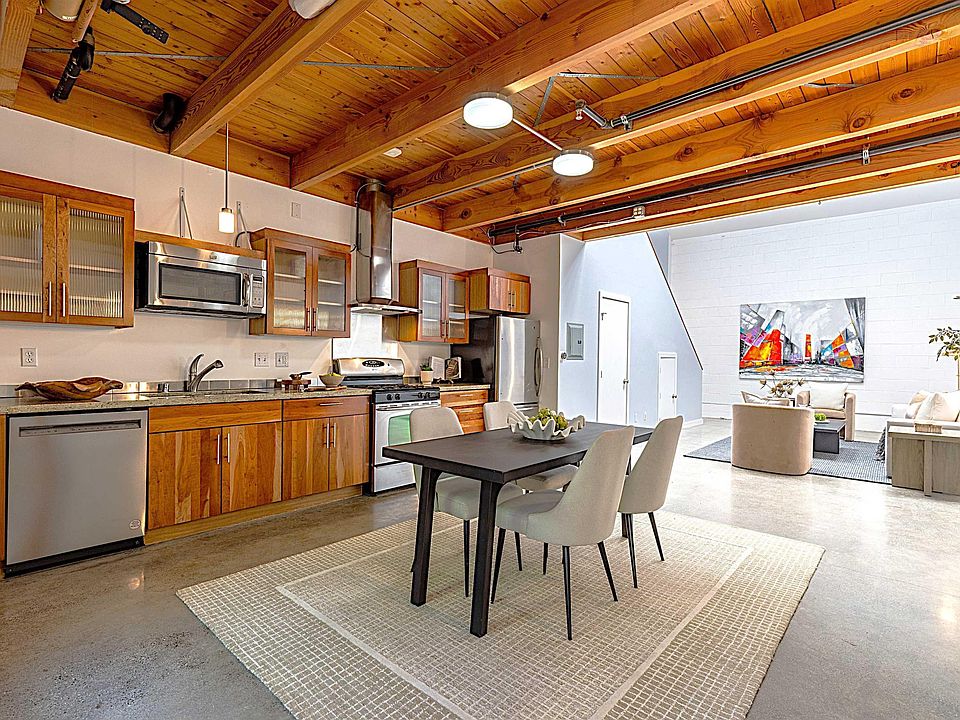 Luxury live/work loft with soaring ceilings, skylights, gourmet kitchen, stainless steel appliances, granite counters, huge windows, polished concrete and hardwood floors, in a lush courtyard gated community. Recently installed hardwood stairs with steel and glass railing to the third level provide an easily accessible bonus room--with a view. Covered parking is electric car friendly and includes storage. Modern flexible floor plan lets you decide what you want. Centrally located in booming West Oakland this gorgeous Thomas Dolan Architecture loft is less than a mile from BART and only one stop from San Francisco. With world class eateries as well as the fabulous West Oakland Farmers Market and the Oakland Ballpark only a short walk away this is a must see!