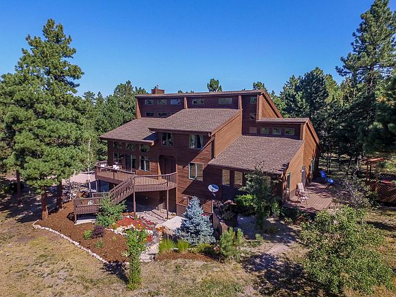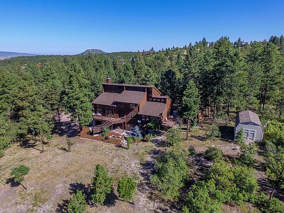 Luxury Larkspur Retreat on 5 Wooded Acres Welcome to your own slice of private paradise in this soaring, dramatic space maximizing the wooded, wildlife & mountain views! Built in 1994 in prestigious Perry Park East & chock full of tasteful updates, this 2-story home with a finished, walk-out basement features an impressive 5 bedrooms, a Loft, study & 3.5 bathrooms over 4,488 Finished Sq Ft (1 basement bedroom is non-conforming without a closet). The exterior is dressed to impress with fresh exterior stain & paint and a newer roof. Flanked by over 1,500 sq ft of freshly stained decks on 3 sides, this home offers unparalleled outdoor living which flows seamlessly from the interior, sun-drenched spaces. Step onto new, wide-plank, rough-hewn oak hardwoods on the vaulted main floor w/wood-beamed ceilings & a grand open staircase forming the spine of this dramatic home. The main floor also features all new light fixtures, new aged bronze hardware, a remodeled tile powder room, new massive ceiling fans & custom door & floor trim. Relax in the living room with 2-story, newer double-paned windows or entertain family & friends in the formal dining room. Leave your cares behind as you step into the private, main floor Master Retreat, complete with another vaulted ceiling, an en-suite 5-piece tile bath with more refinished cabinetry, a jetted soaking tub, massive walk-in closet & a private deck with a gazebo over the new, 8-person hot tub. The gourmet kitchen & cozy family room are truly the heart of this home. Get cooking with new stainless steel appliances (New Bosch Double Oven & Gas Kenmore Elite Cook top!). Abundant refinished cabinetry with new hardware is topped with slab granite counter tops. The breakfast bar ideal for snacks for the kiddos or entertaining with a full spread of goodies. Open to the intimate family room, snuggle up in front of the new stacked-stone & slate gas fireplace with a custom mantle, or pass through the convenient butler pantry to the dining room to make entertaining a breeze. The main floor laundry room offers plenty of cabinet space with the front-loading washer & dryer included. Step straight out onto the backyard deck & survey your domain. Freshly stained with custom inset iron wildlife scenes, this perch offers a birds eye view of the substantial yard & property, with the backyard play set & a fenced dog run. The owners have also invested significant time & money clearing trees & brush around the home for fire mitigation. Upstairs, there is a convenient loft overlooking the main living space which makes a great play room, home office or game room. New 6-Panel doors with new stainless hardware freshen these spacious rooms. Three vaulted & airy bedrooms live large & 2 are linked by a tile & granite Jack & Jill bath. All have new carpeting which continues through the loft down the open, grand staircase to the finished, walkout basement. Once on the lowest level, you will find a huge Rec Room perfect for family gatherings or entertaining. There is new carpeting throughout, including in the study with elegant double glass entry doors & a non-conforming basement bedroom (no Closet). This room would also function as an ideal play room, a home gym or even a craft room. There is also a tiled, three-quarter bath ideal for guests situated between the 2 bedrooms. The boiler has been serviced & there is a new, indirect-fired hot water heater with double capacity to accommodate such a large home. Step outside to relax on the private patio with an idyllic Koi pond. Also located on the basement level is the over-sized 3-car garage with built-in shelving & plenty of room for the toys! Need more room for your stuff? There’s also a 240-sq ft shed with a loft for amazing storage space. The $50/year voluntary HOA covers mulching of trees & yard waste to ensure your yard looks its best year-round! This is Colorado living at its finest.