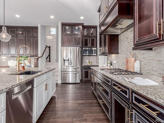 Discover luxury living in this stunning 6 bedroom, 6 bathroom residence located in the coveted Candelas subdivision! Combining elegant design with modern sophistication, this home is sure to impress! Inside, you’ll find stylish chandeliers, a formal living room with a fireplace, and a formal dining room perfect for entertaining. The bright den provides a space for work or relaxation. The expansive family room features a soaring ceiling and a fireplace, offering an ideal gathering spot. The gourmet kitchen is a chef’s dream, boasting stacked cabinetry, granite countertops, and high-end finishes, complemented by a large breakfast room. Retreat to the owner’s suite, a magnificent sanctuary with a private seating area, fireplace, and a lavish spa-like bathroom designed for ultimate relaxation and views of the mountains and downtown Denver. The finished basement expands your living space with a recreation room that includes a wet bar, an island, and outdoor access. In addition, discover a second living room, a spacious bonus room with French Doors (could be an Au Pair suite), and bedroom with a bathroom, but also second bonus room has space for a closet and plumbing for a second bathroom if needed. This exceptional home seamlessly blends elegance, comfort, and functionality in one of Arvada’s most desirable neighborhoods! The home features brand new interior paint, new carpets, and a brand new deck! Each closet has added shelves and drawers for efficient organization.