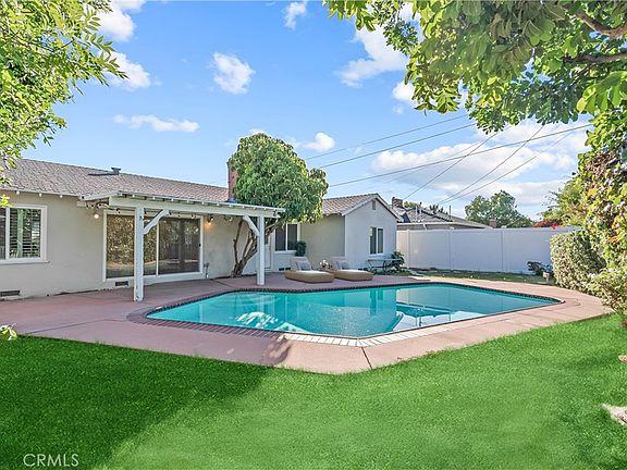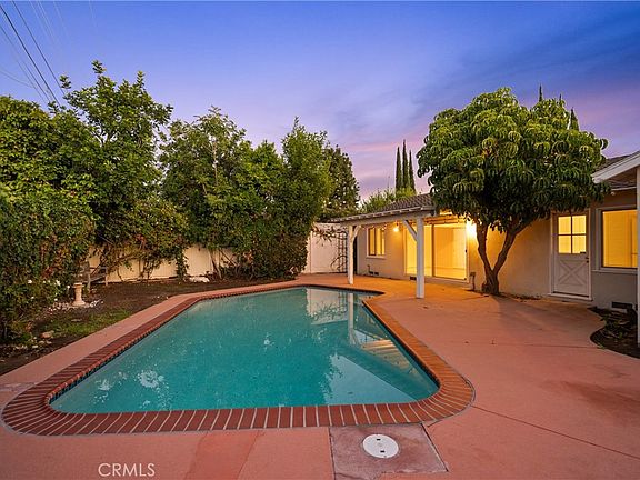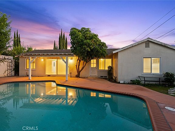 Nestled in the highly sought-after Walnut Cove enclave of homes in Northridge, this charming mid-century ranch home offers a timeless blend of classic character and thoughtful modern updates. Located in a warm, community-oriented neighborhood of well-cared-for homes, this inviting residence features 4-spacious bedrooms, 2-bathrooms, and a private backyard retreat with a sparkling pool—perfect for enjoying the relaxed California lifestyle. A welcoming front porch sets the tone for the home’s inviting interior, where hardwood floors, mid-century design touches, and tasteful updates create a bright and comfortable living environment. The updated kitchen is ideal for any home cook, boasting granite countertops, ample cabinetry, a sunny breakfast nook, and a full suite of appliances including a gas range, electric oven, and dishwasher. A separate laundry room with storage and side-yard access adds convenience. The spacious living room offers the perfect space for relaxing or entertaining, featuring a cozy fireplace, recessed lighting, and a large sliding glass door that opens to the backyard for easy indoor-outdoor living. For more formal gatherings, the separate dining room showcases plantation shutters and recessed lighting, providing a refined setting for hosting. The primary suite is a peaceful retreat with beamed ceilings, dual mirrored closets, recessed lighting, and an en suite bathroom with a tiled shower-over-tub. Three additional bedrooms are bright and comfortable, each with hardwood floors and generous closet space. A full hallway bath with vanity and shower-over-tub serves the secondary bedrooms. Outdoors, enjoy a private north-facing backyard that welcomes morning sun and afternoon shade—perfect for quiet mornings, evening dining, or lounging by the sparkling pool. Mature landscaping and a covered patio enhance the tranquil setting. Additional highlights include dual-pane windows (most), raised panel doors, central air and heat, copper plumbing (most), a 200-amp electrical panel, composition roof and an updated sewer line. Conveniently located near CSUN, schools, shopping, dining, and major freeways, this special home perfectly combines vintage charm, modern comfort, and everyday convenience. Some photos have been virtually staged.