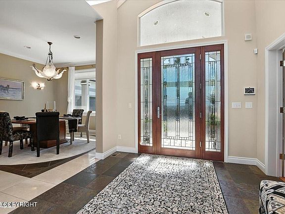 Situated at the end of a peaceful cul-de-sac, this beautifully designed Crown Pointe home offers exceptional living inside and out. With over 10 parking spaces, a gravel pad for RV parking or snow storage, and professionally landscaped grounds featuring extensive rockwork and perennial gardens, every detail has been thoughtfully planned. Inside, the chef's kitchen is the heart of the home,boasting a 48'' Wolf 6-burner gas range with griddle and double ovens, Sub-Zero refrigerator, two large islands, and cherry DeWils cabinetry. The main floor features 10-foot ceilings, formal living and dining rooms, custom cherry built-ins at every turn, and three gas fireplaces for added warmth and ambiance. The primary suite has its own fireplace, a spa-like ensuite with granite counters, frameless glass shower with custom tiled walls, a jetted tub, and unmatched 180-degree views of Denali and the Alaska Range. There is also private access to the large Trex deck where you will enjoy western sunsets. A wheelchair-accessible mother-in-law suite includes a private deck, kitchenette with Sub-Zero fridge and built-in microwave--ideal for extended guests or multi-generational living. The 2,100 sq ft basement is nearly complete, designed for one bedroom and two bathrooms, and features two large flex rooms--perfect for a home theater, gym, or recreation space. Just add flooring and fixtures to make it your own. Additional highlights include radiant in-floor heat (including garage), air conditioning, Guardian security system, whole-house audio, updated heating system with HRV air recovery system.