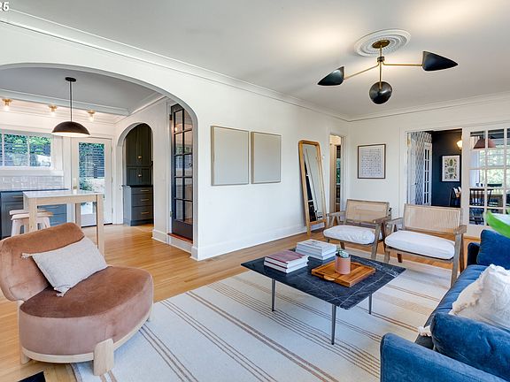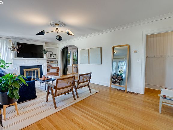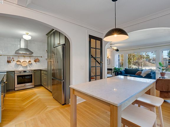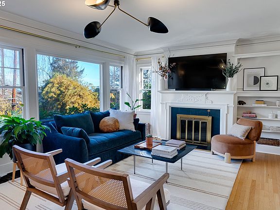 Perched above the street between Goose Hollow and Portland Heights, this meticulously restored 1925 Craftsman blends historic charm with modern luxury. Flooded with natural light, this private retreat features an open loft flowing to a balcony with breathtaking city and mountain views. Walk to NW 23rd, Washington Park, and PSU Farmers Market. The architect-designed kitchen showcases quartz countertops, tile backsplash, floating shelves, built-in bar with beverage fridge, and herringbone wood floors. Designer light fixtures illuminate refinished hardwoods and preserved period details including a gas fireplace, built-ins, and crown molding throughout. The flexible floor plan offers French doors opening to a dining room that doubles as a fourth bedroom with closet. The light-filled upper loft provides versatile space for a home office or studio, accessing the private balcony capturing stunning mountain, gorge, and downtown views. Entertain with pet-friendly turf, hardscape patio, elevated terrace, and picturesque landscaping. This home offers extensive upgrades including a new roof, completely remodeled kitchen, updated bathrooms, fresh paint, and new furnace with AC. Located in the desirable Lincoln School District and walkable to Ainsworth Elementary—where historic elegance meets contemporary Portland living.