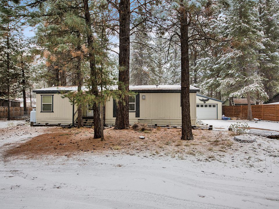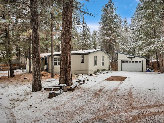 Really cute home on a flat half acre surrounded by ponderosa pines. This 3 bedroom 2 bath home has been thoughtfully designed with an open floor plan and good separation between the primary and guest bedrooms. There's a nice covered deck in the backyard to sit and relax on. The detached garage provides plenty of storage for all your needs. The property is fully fenced with plenty of space for an RV and toys. Located within close proximity of Sunriver, Mt. Bachelor and everything that Central Oregon has to offer!