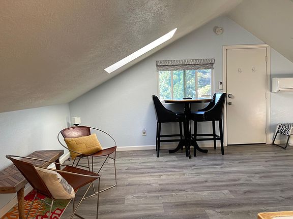 By the window, a pub table with two bar stools offers the perfect perch to sip your morning coffee while soaking in the canyon views. Under the sloped ceiling, you'll find a two leather chairs for extra seating.