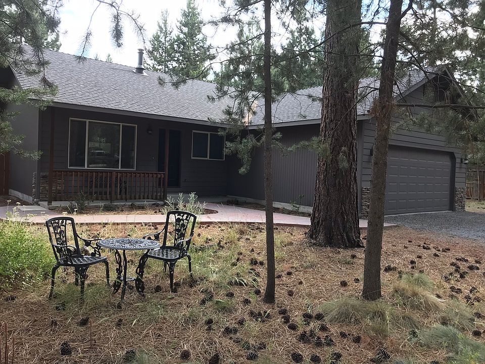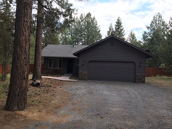 Single family home situated at the edge of the Deschutes National Forest. Privacy fence allows your time spent outside to be your own. Three carpeted bedrooms and two full, tiled bathrooms. Laundry area enclosed by bifold doors keeps the area out of sight. Open concept allows for spacious entertaining in the living, dining and kitchen that has stress free laminate flooring. While this home is not large in area it feels much bigger. Two car garage with handy coat closet just inside also makes for efficient use of the interior. The front door is protected with roof that also provides for dry area outside to store firewood for those cool nights or cold days. The front porch also offers seating for a great view of the trees and wildlife in the area. The back has a newer roof over the 10 by 12 foot patio which allows for seating area and outdoor grilling. The back yard is fenced in for pets but has a gate to the expansive national forrest. Two car attached garage provides ample storage area as well as no need to be out in the open weather when coming or going. This is not a large house but perfect for starter families or retired couples or even a great place for family members to vacation in summer/winter. Plenty of room for RV parking by the garage with electric access.
