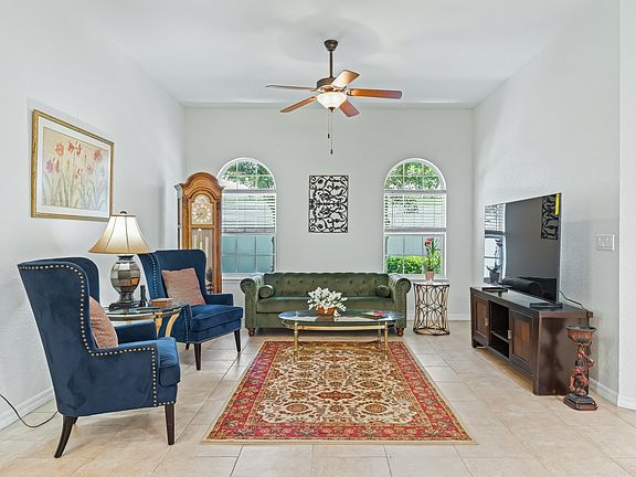 This fully furnished home is located in Stonecrest, a 55+ gated golf course community. The 3rd bedroom can be used as a den, has no closet, and contains a sofa bed. This property is minutes from The Villages and numerous restaurants. Stonecrest has 4 pools, pickleball courts, softball, 18 hole championship golf course, and Broad Stripes Golf & Social Club. It is a community with private roads and 24 hour security.