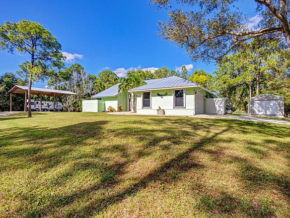 Jupiter Farms 4 bedroom 2 bath CBS home on 1.87 acre corner lot! This home features updated kitchen cabinets and quartz countertops with GE Cafe wall oven and microwave. They family room features a cozy wood burning fireplace perfect for the holidays. Both bathrooms have been completely renovated as well. Exterior features include large screened in patio with resort style heated salt water pool and fire pit, perfect for entertaining and very private. Bring your Boat or RV there is a 30'x40'pole barn with metal roof. The Home also has brand new Impact Windows and New Metal Roof in 2022. This property features 2 separate entrances, on for Pole Barn access and one to driveway and garage access. This home is on a paved road with easy access to I-95 and the Turnpike.