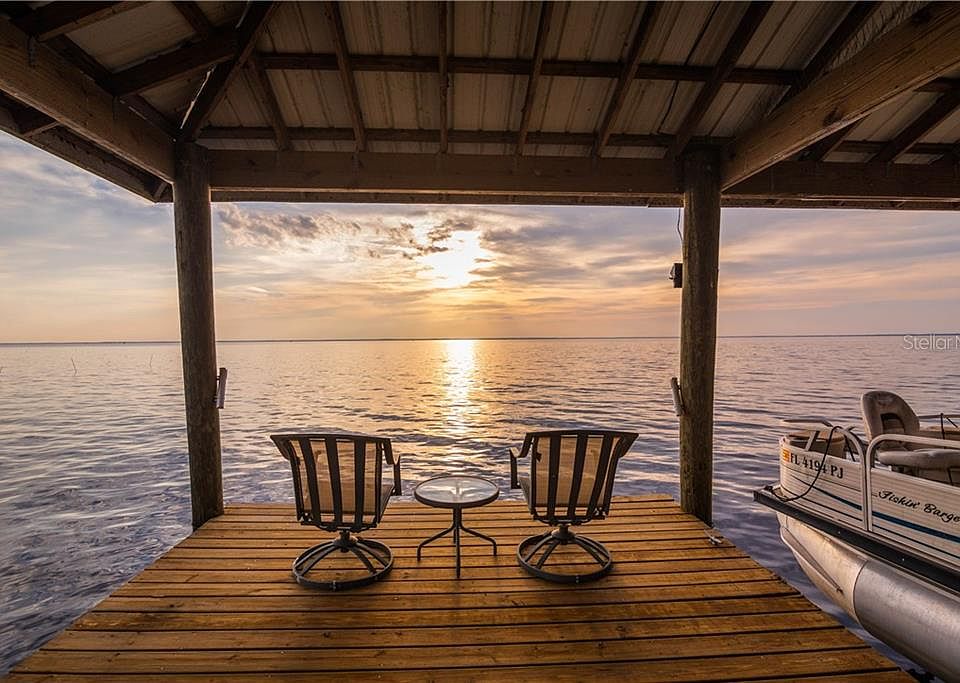Don't miss out on these breathtaking views of Lake George and St John's River! If lake living is your style....don't miss out on this opportunity. This stilt home sits on a quiet cul-de-sac and features 2 bedrooms, 2 baths, and has tile floors throughout. The kitchen counters are granite with newer appliances and cabinets. Sliding doors from the living room and dining room lead you to the enclosed porch so you can enjoy your morning cup of coffee while you look onto the spectacular views and enjoy the wildlife. In the evenings, take a stroll on your lit dock to enjoy sunsets on the covered boathouse. The boathouse has an electric lift and also has water for your kitchen needs. The property has over 100 ft of lake frontage, a huge covered patio for an RV/boat, and a 12x26 new metal-framed carport. This home is ready for your boat and hours of fishing or just enjoying nature.