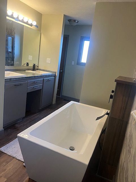 This is the master suite of a 2300 sq ft house. The suite is 500 sq ft, has its own entrance and its own large private patio (pictured). Newly remodeled, with jetted shower, soaking tub, closet barndoors, and new flooring. Utilities are included. New Kitchen, 2 fridges, 2 washers and dryers, 18 ft double stone fireplace, 2 court yards, level back yard. Female only, no overnight guests.