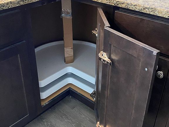 Glass cook top stoveLazy susanLinen closetDouble sink vanityStainless steel appliancesFrench door refrigerator