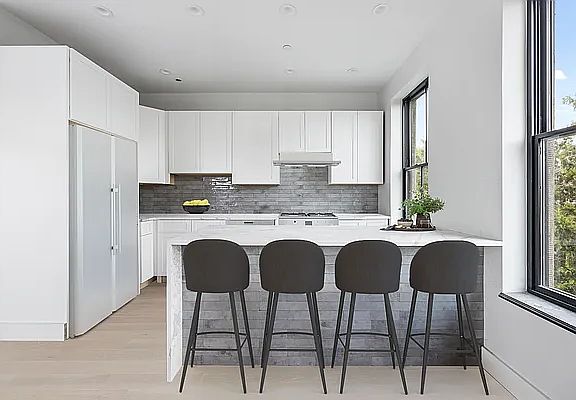 The sun-drenched upper level is bathed in natural light from three exposures & nine oversized windows, creating a loft-like ambiance with open-sky and city views. The living and dining areas flow effortlessly into a gourmet kitchen appointed with custom cabinetry, white marble countertops, a statement island, dishwasher, and professional-grade appliances. The terrace extends directly from this space, ideal for al fresco dining or evening cocktails beneath the skyline. A marble-clad powder room completes the level.