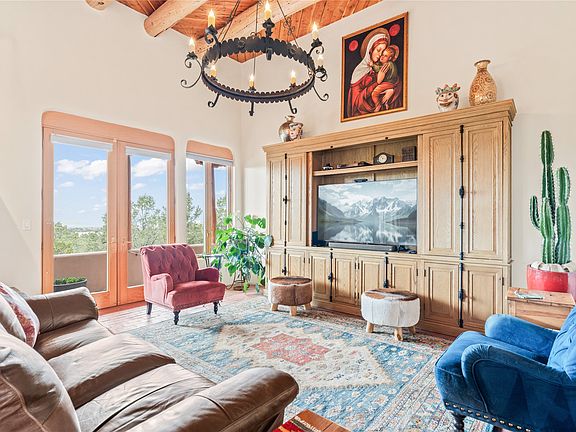 THE JEWEL OF ALTEZA ESTATES. Privacy and astounding views from this spectacular light and bright property with lush rose gardens and long-range mountain views from the entertainer's portal complete with fireplace. The sunroom's abundant windows open to a covered wrap-around portal which has many seating and dining options. Beautiful, remodeled cook's kitchen with quartz counters, Sub-Zero refrigerator, Wolf range with gorgeous maple cabinetry and pantry. Island has a prep sink and storage. Luxurious primary bedroom has room for a seating area, viga ceilings and a kiva fireplace. Spa bath has large separate shower, quartz counters, double sinks and a large walk-in closet. Dramatic living room with fireplace opens to dining room with handmade built-in sideboard. Two guestrooms and spacious guest bath with separate tub and shower. Generous fully fenced backyard. Landscaping all on drip. Four fireplaces. Pretty powder room. Walled front courtyard. All this on a paved road in a small, gated community. Approved ILR is in supplements and lot corners are flagged. Tankless water heater. Gorgeous Restoration Hardware entertainment center in living room conveys with the property. WIRSBO tubing in the floors, copper in the walls. Overzised and tall finished 2-car garage with great storage. There is a spot for a casita. NO CARPET. NO KITEC. Most of the furnishings can stay with the house at no charge if buyer wishes - a few exclusions in supplements.