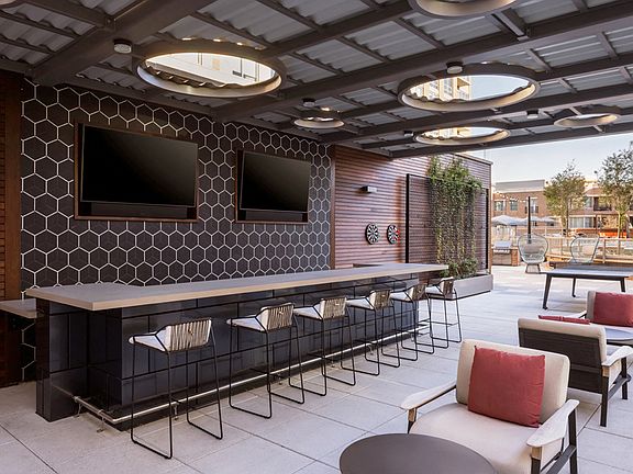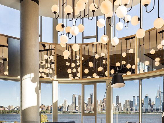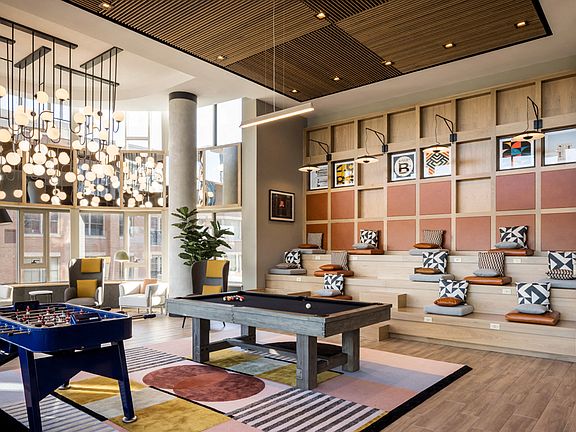 - Exterior features: BBQ/Picnic Area, Bicycle storage, Business Center, Concierge, Courtyard, Designer fixtures in kitchens and bathrooms, EV charging stations, Easy access to shopping and dining, Free Weights, Garden, Generous windows with built-in sunshades, Golf simulator, Green Building, High-efficiency, modern accent and room lighting, Indoor dog wash and grooming room, Indoor storage spaces, Luxurious wood plank style flooring throughout, On-Site Maintenance, On-Site Management, Package Receiving, Private garages available, Quartz countertops and full-height backsplashes, Spacious closets with customized shelving, Sundeck, TV Lounge, Targeting LEED Silver Certification, View Type: Views of Manhattan with select apartment homes, Wine coolers with select apartment homes