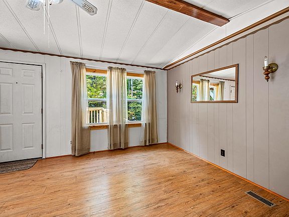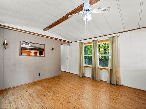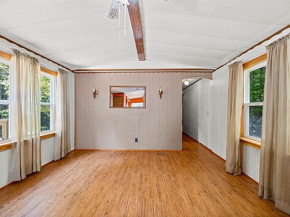 Discover easy living in this two-bedroom singlewide mobile home, situated on a generous 0.91-acre lot at the end of a quiet cul-de-sac. The home features a functional layout including an eat-in kitchen, living room, and a full bathroom with a stand-up shower. The bathroom is conveniently connected to the main living area and the primary bedroom. The layout includes space to easily accommodate the addition of a tub. The exterior boasts a large, level, private yard with a 14x14 deck and two sheds for storage. Enjoy the convenience of town water and sewer, a carport, and a paved driveway. This convenient location is within walking distance to a local store, and close to town recreation fields and the town bike path. A great opportunity for comfortable living with easy access to amenities. Open House 10/4 from 12-2pm.