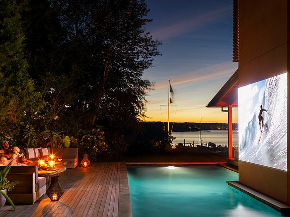Waterside poolFloor-to-ceiling glass doorsWest facing water viewsPlenty of lawn spaceSurround soundOutdoor shower
