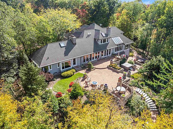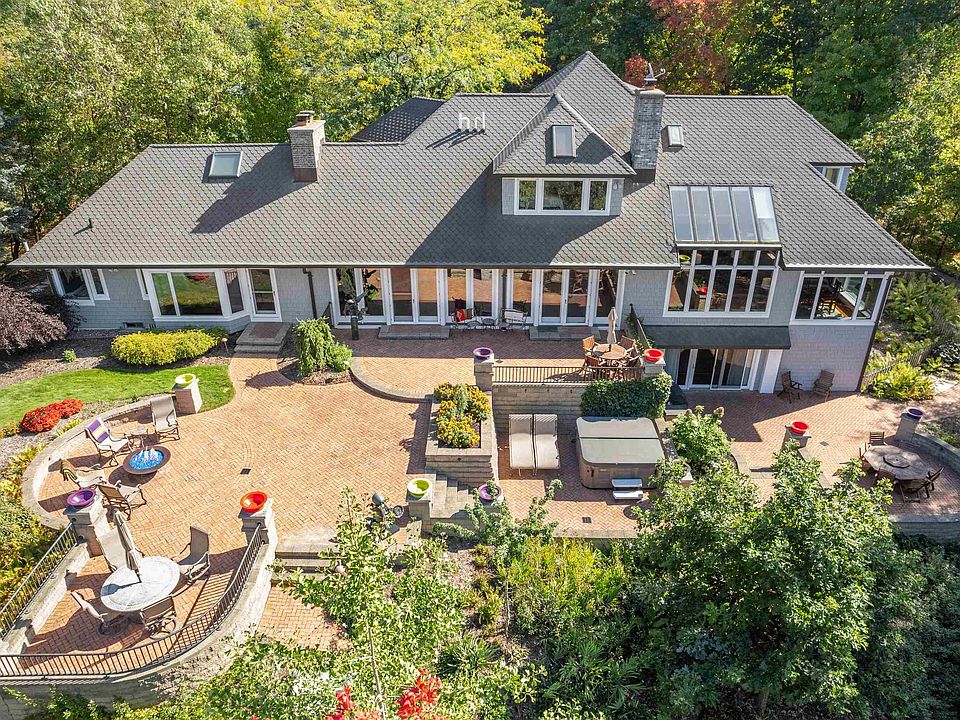 If you cherish nature, security and beautiful interior spaces, this gorgeous riverfront home is THE ONE! Exceptional opportunity for privacy w/great proximity to amenities. Kitchen & living room boast floor-to-ceiling views. Primary suite features fireplace, walk-out to patio, double-size programmable shower + soaker tub. 2 add'l BR w/ensuite baths. Gorgeous bar in LL plus climate-controlled wine cellar, office & artist studio. Ravine to the back surrounded by hardwoods w/205+ft of river frontage. Outdoor patio (2400 sq ft) space features hottub, tiered spaces, gas firepit, grilling station. Exceptional landscaping. Commercial-grade technology. Full amenities list available by request. Some pics digitally colorized. Actual room pics included here, as well.