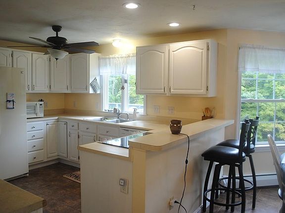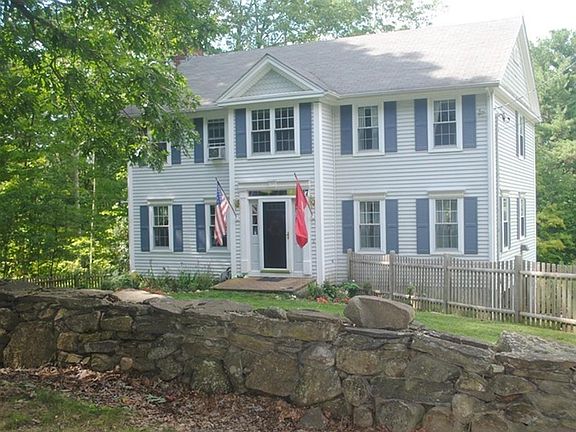 In a country setting, bordered by stone walls, but minutes to the center of town sits this 4 bedroom colonial. It has a front to back living room with a pellet stove for alternative heat and a fireplace for ambiance and sliders to a deck that overlooks the backyard. A large country kitchen includes both a breakfast island and room for a table. Off of the kitchen is a spacious dining room with wainscoting. An open stairway to the second floor finds a sitting area and 4 large bedrooms and 2 full baths. The lower level has a laundry room, sliders to the backyard and hot tub and a 2 car garage. Hardwood floors throughout and fresh paint make this a perfect spot for new owners.
