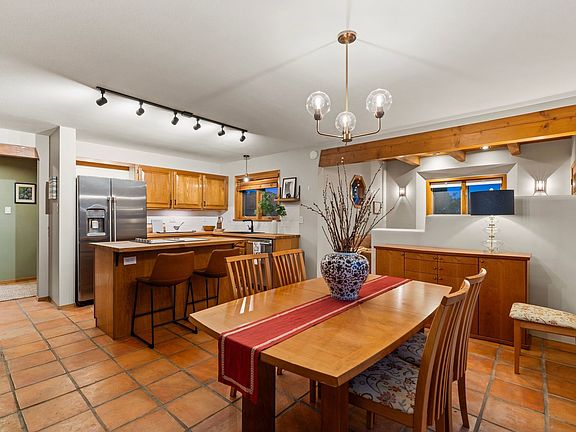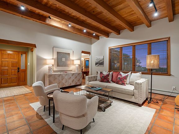 Enjoy mountain views and unforgettable sunset skies from this single-level home in desirable Arroyo Hondo West. Designed to capture natural light and scenic vistas, this inviting residence blends Santa Fe charm with modern updates. The spacious living room features soaring beamed ceilings, a classic fireplace, Saltillo tile floors, warm wood trim and built-in shelving for an open yet welcoming feel. The updated kitchen offers butcher block counters, stainless appliances, upgraded lighting and a wine fridge, flowing easily into the dining and den areas that open to a serene patio. The primary suite is a peaceful haven with a walk-in closet, double vanity and step-in shower. Set on expansive acreage with sweeping views, the property invites outdoor living, gardening or future expansion. Located in a quiet, established neighborhood just moments from the Rail Trail and about 15 minutes from the Plaza, this home combines tranquility and convenience.
