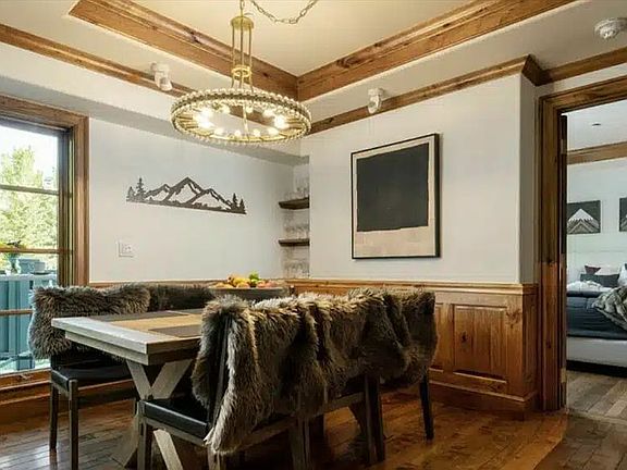 The two-bedroom plus den, three-bathroom condominium blends refined mountain modern design with luxurious functionality. Expansive windows and a private patio frame breathtaking alpine views, while the stone fireplace anchors a warm, inviting living space. A chef’s kitchen with top-tier appliances makes entertaining seamless, whether for intimate après-ski gatherings or family holidays.