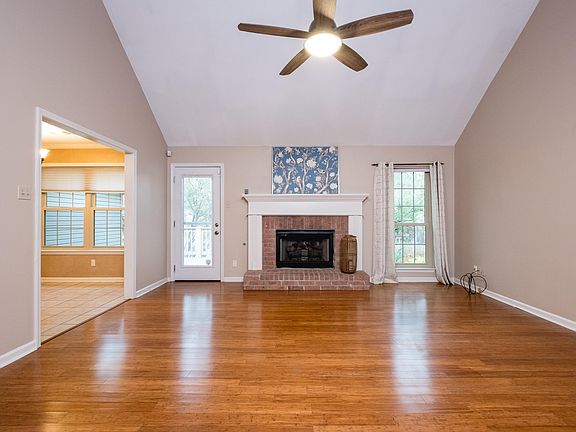 Lovely traditional brick and vinyl home with great curb appeal on a quiet cul-de-sac. New architectural shingle roof (2024), new HVAC system (2023), new hot water heater (2024), and newer vinyl windows add to the home's recent improvements. Wood floors in the main living areas and newer carpet in the bedrooms. Flexible front room can function as a formal living, dining, or office. Large great room with vaulted ceiling and gas log fireplace. Split floor plan features a spacious primary bedroom with vaulted ceiling and bath with soaking tub, walk in shower, and walk in closet. Two guest bedrooms share the hall bath with a new shower. Eat in kitchen with electric range, dishwasher and pantry. Laundry room plus a 2 car garage with storage. Deck overlooks the fully fenced backyard. Wonderful home ready for your personal touches. Come see!