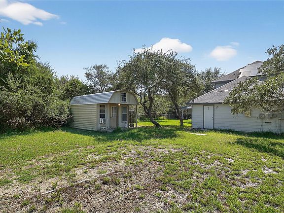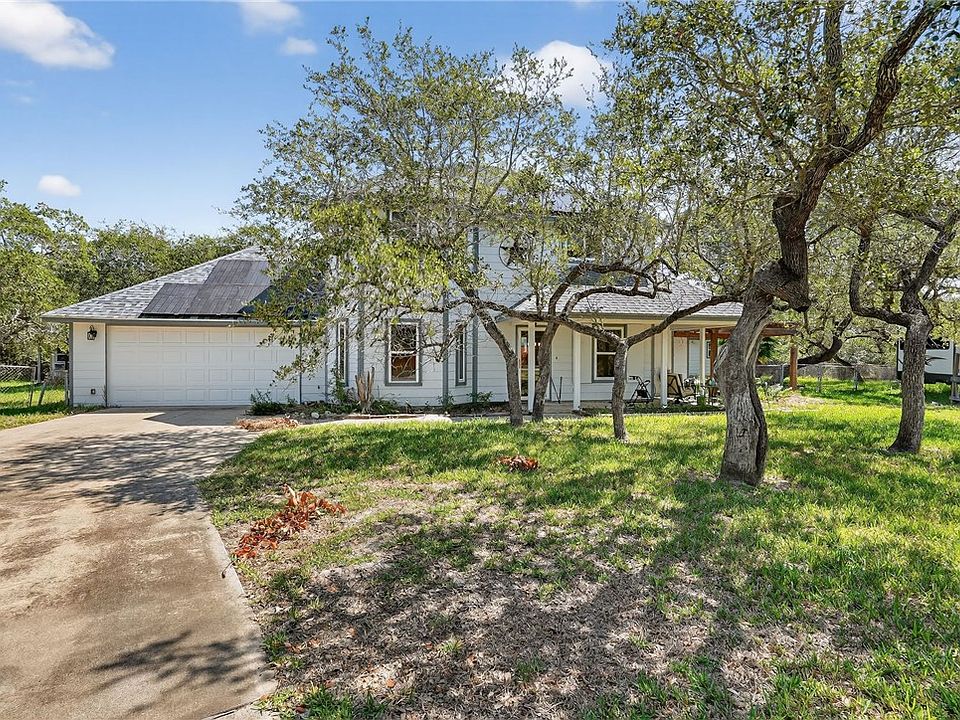 Located minutes from St. Charles Bay for great fishing and Goose Island State Park, this is a prime spot for those that love the outdoors. Surrounded by towering oak trees on nearly 1/2 an acre, you will love the serenity this property offers. A large covered porch attached to a 520 sqft workshop, plus an additional storage building providing ample space for hobbies and organization. An added 50amp plug for RV connection. Inside, the main level features two living areas, a half-bath, and a spacious office that opens to a welcoming covered front porch. Upstairs, the primary bedroom and bath are joined by two additional bedrooms and a full bath. Solar panels add efficiency to this property, blending comfort with sustainability.