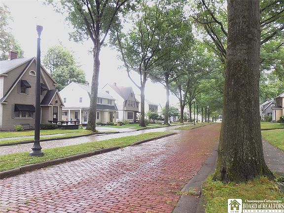 Located on a charming brick street with a center boulevard, is this colonial style home which is situated in one of Jamestown's most sought after neighborhoods. The home is just a nine iron from Moon Brook Country Club, Jamestown Community College, walking paths for family and pets, Route 60 and Interstate 86. This special home features a 24' living room with pretty spindled staircase, built-ins and wood burning fireplace. The formal dining room has attractive chair molding, doors to a rear yard deck and is just steps away from the modern eat in kitchen with Cherry cabinetry and the kitchen appliances are included. There is a first floor den with French doors that offers casual living. The updated bath and three bedrooms are on the second floor. There is attic and basement storage. Some of the other distinguishing features includes low maintenance exterior finishes, many new windows, some hardwood flooring under carpeted areas, FWA furnace is ~5 years old, circuit breakers, a front entry porch, utility shed, private rear yard with some privacy fencing and a detached one car garage.