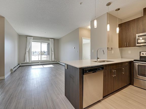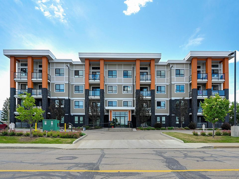 Welcome home to this SUNNY SOUTH FACING spacious condo with 2 bedrooms 2 bathrooms in THE RIDGE in the heart of DEVON conveniently located within walking distance to schools, parks, groceries, restaurants, outdoor pool, arena and the river valley walking/biking trails. This modern open concept floor plan offers premium finishing throughout with 9' ceilings and the bedrooms at the opposite ends of the living room. The gourmet kitchen has espresso color cabinetry with soft close, quartz countertops and stainless steel appliances. South facing deck with a gas BBQ outlet. Vinyl plank flooring throughout except for tile in the bathrooms. Roughed in for A/C. Included is the fridge, glass top stove, built-in microwave, dishwasher, INSUITE WASHER AND DRYER and TITLED UNDERGROUND PARKING Unit 35 (Actual stall #3) with a storage cage. A great place to call home!