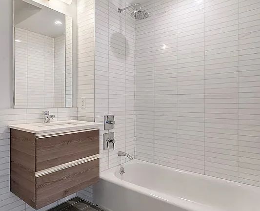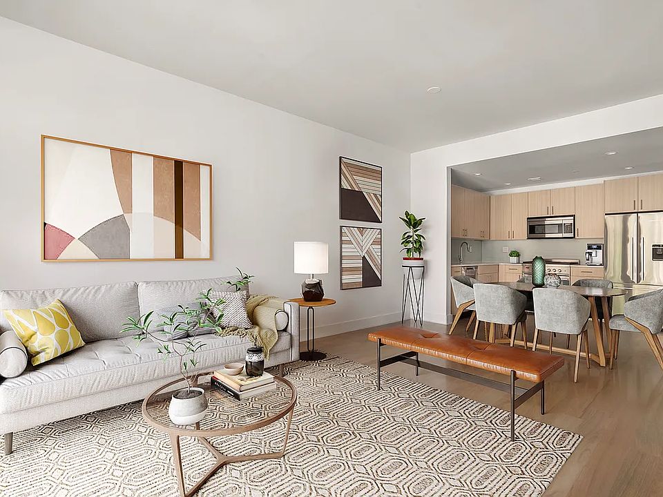 Located in the Factory District, this building has a gym with Peloton equipment, a bike room, lounge area and virtual doorman, all included in the rent.