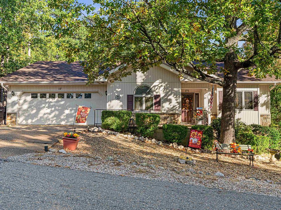 Welcome to 17 Coronado Lane, a beautiful 3-bedroom, 2-bath home offering a flat driveway and privacy thanks to a large area of common property behind the house. Super convenient! 2 minutes from fitness center, POA, churches, and trails. Quick access to Hwy 5 via Danville Gate for downtown Hot Springs. 6 minutes to Dollar General Market. The interior features an open floor plan, showcasing hardwood floors and vaulted ceilings in both the living room and bedroom. Enjoy the seamless flow between the cozy dining area and the kitchen, which includes a convenient bar for extra seating. A stunning, large sunroom with a vaulted ceiling, abundance of windows, and serene view provides year-round enjoyment. Notable features include a 2024 roof, peach tree windows, wood burning fireplace, and HVAC system that includes a whole house filter and Pure Aire UV Light. A private deck extends your main-level living space. The lower level is accessed from outside and features a versatile, heated and cooled shop/game/craft room that opens onto a screened-in patio. Lower room can double as a safe room. The large backyard is perfect for outdoor activities and could easily accommodate a fence for pets.