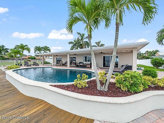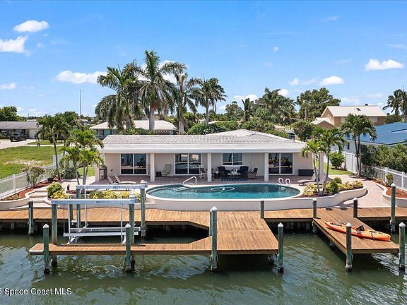 Live the ultimate Florida lifestyle in this waterfront retreat in Cocoa Beach! This well maintained 4 bedroom 2 bath POOL home sits directly on the Banana River's main channel, offering NORTH FACING wide open water views, year round sunrises AND sunsets, and the very best of Florida coastal living! With almost a 100 ft of water frontage, the oversized dock is reinforced with hurricane straps, equipped with a 13,000 lb boat lift, has deep water access, and allows plenty of room for jet skis and kayaks! The interior features a light-filled layout with expansive river-facing impact windows and sliders making storm prep a breeze! The galley kitchen opens to the dining area and has wood cabinetry and granite countertops. The primary suite offers gorgeous water views and direct access to the pool and patio! A true split floor plan, three additional bedrooms are located on the opposite side of the home and provide plenty of flexibility for family, guests, or a home office. This concrete block home has a concrete tile roof, oversized 2 car garage, knockdown ceilings, tile flooring, 2020 AC condenser, copper water lines replaced to pvc in 2022 and so much more. With NO HOA, this home is perfect as a primary residence, second home or short term rental property and delivers the ultimate waterfront lifestyle. Nestled in the active, beachside, waterfront community of "Country Club" and with views of the cruise ships docked at Port Canaveral, daily dolphin tour boats, rocket launches, manatees, dolphins playing, sunrises and sunsets, there is something different to watch daily. A short walk, bike, or a golf cart ride to World Famous Cocoa Beach, the Cocoa Beach Country Club and Aquatic Center, 27 hole golf course, A+ rated schools, dining, and entertainment you will enjoy living the active FL lifestyle all year long!
